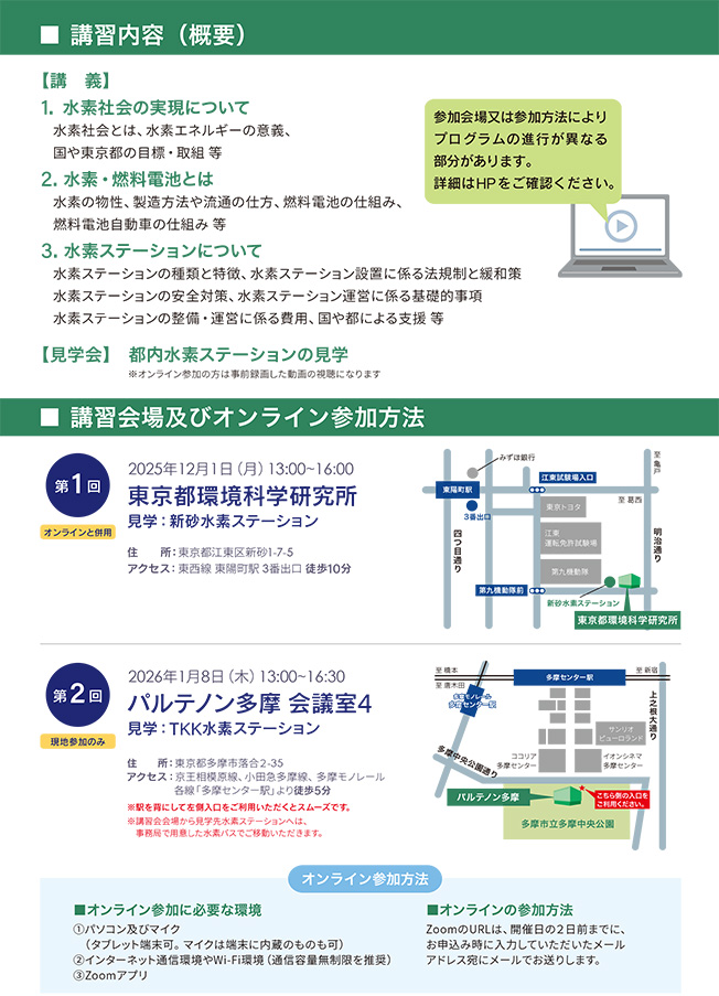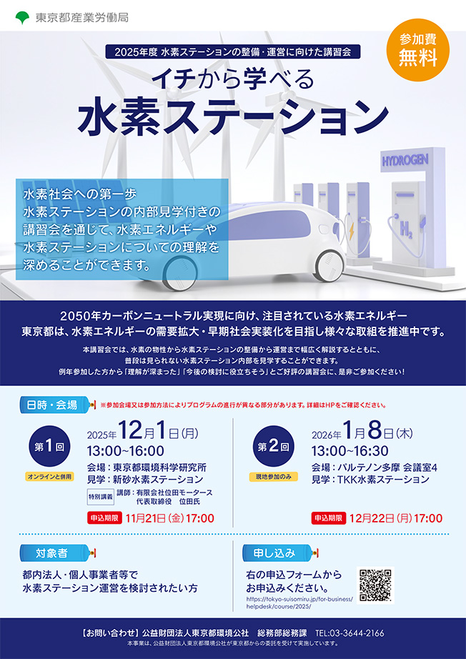 都内法人・個人事業主等で、水素ステーション運営を検討したい方を対象に、年に2回水素ステーションに関する講習会を開催しています。座学のほか、実際に運営している都内の水素ステーションも見学します。オンラインでの参加も可能です。開催時期になりましたら、こちらのページでお知らせいたします。